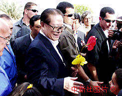 江澤民主席十四日在以色列參觀類似中國(guó)“人民公社”的農(nóng)莊——基布茲,接受兒童的獻(xiàn)花。中新社記者:彭偉祥