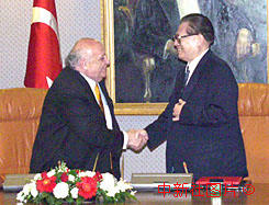 中國國家主席江澤民與土耳其總統(tǒng)德米雷爾4月19日在安卡拉會談后簽署了聯(lián)合公報。中新社記者 彭偉祥 攝