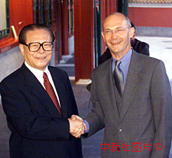 中歐十九日達(dá)成中國(guó)入世協(xié)議后,江澤民主席在會(huì)見歐盟貿(mào)易委員拉米一行。 2000年5月19日 21:21 ![]() 中國(guó)與歐盟十九日達(dá)成了中歐之間關(guān)于中國(guó)加入世貿(mào)組織的雙邊協(xié)議后,國(guó)家主席江澤民在北京中南海會(huì)見歐盟貿(mào)易委員拉米一行。 |