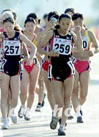 奧運(yùn)冠軍王麗萍禮讓金牌 老將王妍折桂收山 2001年11月19日 10:59 ![]() 遼寧競走選手王妍(259號)十九日在中國第九屆全運(yùn)會女子二十公里競走比賽中,以一小時二十六分二十二秒的成績打破亞洲紀(jì)錄并獲得冠軍。中新社記者 毛建軍 攝 ![]() 十九日,遼寧選手王妍在九運(yùn)會田徑二十公里女子競走決賽中,以一小時二十六分二二的驚人成績打破亞洲紀(jì)錄,奪得該項目金牌。中新社記者 陳文 攝