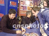 ![]() 今天中午,達拉斯小牛隊的高大中鋒王治郅出現(xiàn)在紐約市中心NBA專賣店里。他是第一個被美國職業(yè)籃球隊選中的中國球員。為表彰他的卓越才華和對籃球運動的貢獻,一套以他個人肖像為主題的法定郵票今天開始公開發(fā)售。中新社記者 陳建 攝