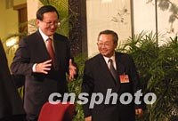 ![]() 中國外交部長唐家璇與九屆全國人大五次會議新聞發(fā)言人曾建徽,六日走出人民大會堂記者招待會現(xiàn)場。唐家璇在會上說,中國入世有利于香港繼續(xù)維持包括國際金融中心在內(nèi)的三個國際中心地位。中新社記者 劉殊瑾 攝
