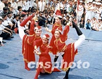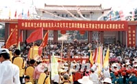 ![]() 2002年中國(guó)民間藝術(shù)游海南冼夫人文化節(jié)開(kāi)幕式,日前在海南省瓊山市新坡鎮(zhèn)舉行。冼太夫人是南北朝時(shí)代(公元六世紀(jì))的卓越政治家和軍事家 ,歷史上對(duì)海南的經(jīng)濟(jì)發(fā)展和民族團(tuán)結(jié)作出很大貢獻(xiàn)。圖為開(kāi)幕式文藝演出。中新社圖 岑有富 攝