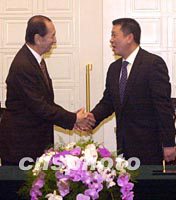 ![]() 澳門特區(qū)政府與澳門博彩股份有限公司二十八日簽署博彩經(jīng)營批給合同,圖為行政長官何厚鏵與澳博公司董事長何鴻燊在簽約完成后互相握手。中新社記者 宗金柱 攝