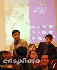 多圖:神秘青年天價買走宋徽宗《寫生珍禽圖》 2002年04月23日 22:36 ![]() 宋徽宗親筆畫《寫生珍禽圖》二十三日在北京拍賣會上以兩千三百萬元人民幣的天價創(chuàng)下中國古字畫的最高價格。圖為激烈的競拍場面。中新社圖 武仲林 攝 ![]() 一位不愿透露身份的神秘人物二十三日在北京中國嘉德春季拍賣會上以兩千三百萬元人民幣的天價競得《寫生珍禽圖》。這幅從海外征集歸來的稀世珍寶是世存十三件宋徽宗親筆畫之一。圖為神秘得主競買成功后掩面離開拍賣場。中新社圖 武仲林 攝 ![]() 亡國皇帝宋徽宗國寶畫卷《寫生珍禽圖》,日前驚現(xiàn)北京,參加四月嘉德國際春季拍賣。亡于千年前“靖康之恥”的宋徽宗趙佶,史稱治國無能的大藝術家皇帝,傳世僅十九件畫卷價值連城。圖為卷首有乾隆皇帝題寫的《杏苑春聲》。中新社記者 賈國榮 攝 ![]() 亡國皇帝宋徽宗國寶畫卷《寫生珍禽圖》,年初由海外神秘人士出手,日前驚現(xiàn)北京,參加四月嘉德國際春季拍賣。亡于千年前“靖康之恥”的宋徽宗趙佶,史稱治國無能的大藝術家皇帝,傳世僅十九件畫卷價值連城。中新社記者 賈國榮 攝 中新社北京四月二十三日電(記者于晶波)今天中午十二時,從海外征集歸來的稀世珍品——宋徽宗親筆畫《寫生珍禽圖》在中國嘉德春拍會上被一位二十多歲神秘青年買走。這位青年開出的二千三百萬元(人民幣,下同)的競拍天價創(chuàng)造了中國書畫拍賣史的最高記錄。 今天上午十一時四十分左右,當拍賣師宣布完《寫生珍禽圖》的起拍價為七百八十萬元后,立即有人舉拍應價。十幾分鐘后,拍賣價格輕易突破一千萬元和兩千萬元大關。 記者在現(xiàn)場看到,當《寫生珍禽圖》的價格升至一千五百萬的時候,競價方主要在幾位電話委托的買家之間進行。這幾位電話委托買家迅速將該畫價格推至一千九百萬。正當場外激烈競價不分高低時,場內(nèi)的一匹黑馬(競拍號為九三六號的男青年)叫價介入,最后以二千三百萬的天價將國寶《寫生珍禽圖》買走。 目前,這位聲稱不接受任何現(xiàn)場采訪的神秘買家的身份尚難確定。嘉德公司副總經(jīng)理寇勤也表示不清楚這位買家究竟是來自國內(nèi)還是海外。 在海外流落多年的《寫生珍禽圖》長卷是宋徽宗存世僅十二件的親筆畫之一,與宋高宗的《養(yǎng)生論》卷同為國寶級文物。參加拍賣會的許多文物愛好者都希望這件國寶能借春拍會的機會被留在國內(nèi),因此他們希望今天的神秘買家來自國內(nèi)。 嘉德公司總經(jīng)理王雁南對今天《寫生珍禽圖》的天價拍出表示滿意。據(jù)了解,此前嘉德公司對該畫的估價僅為九百萬元。