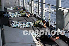 中國(guó)海軍編隊(duì)穿越馬六甲海峽進(jìn)行反海盜演練(圖) 2002年05月28日 16:45 ![]() 北京時(shí)間5月28日凌晨,中國(guó)海軍首次環(huán)球航行訪問艦艇編隊(duì),穿越長(zhǎng)約600海里馬六甲海峽,駛?cè)胗《妊髸r(shí),“太倉(cāng)號(hào)”綜合補(bǔ)給艦的官兵日夜戒備,并進(jìn)行反海盜演練。張全躍 攝