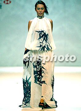 圖:港時(shí)裝節(jié)展示鄧達(dá)智的“水墨畫(huà)”女裙 2002年07月12日 10:11 ![]() “2003香港春夏時(shí)裝節(jié)”7月10日晚舉行香港十位頂尖設(shè)計(jì)師作品展示,模特身著設(shè)計(jì)師鄧達(dá)智的一件上繪墨竹全白透明沙裙款款款而行,宛如一幅流動(dòng)的中國(guó)水墨國(guó)畫(huà)。任晨鳴 攝