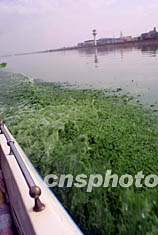 圖:昆明滇池個(gè)別水域綠藻泛濫 2002年07月16日 19:27 ![]() 昆明滇池個(gè)別水域最近綠藻泛濫,污染嚴(yán)重。快艇駛過(guò)時(shí)激起綠色的浪花,臭氣熏天。中新社記者 史利 攝