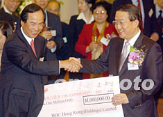 ![]() "中銀香港(控股)有限公司"7月25日成功在香港上市掛牌后,中國銀行副董事長,中銀香港(控股)有限公司、中國銀行(香港)有限公司副董事長及總裁劉金寶(右)向香港公益金籌款委員會主席柯清輝贈(zèng)送一百萬港元支票。任晨鳴 攝