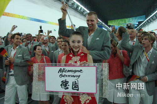 8月8日晚上,唐雯帶領(lǐng)著465名德國(guó)隊(duì)員走入了鳥巢,她舉著牌子,后面緊跟的是德國(guó)隊(duì)的旗手、NBA著名球星諾維斯基……