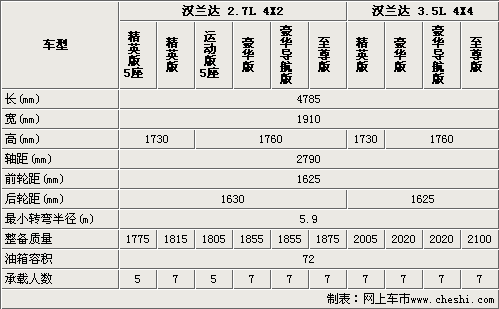 國產(chǎn)漢蘭達(dá)的車身尺寸與進(jìn)口車型相同,由于國產(chǎn)漢蘭達(dá)精英型沒有配備車頂行李架,所以要比運(yùn)動(dòng)版、豪華版和至尊版矮了30mm。將近2.8米的軸距為漢蘭達(dá)提供了舒適的內(nèi)部空間。國產(chǎn)漢蘭達(dá)較進(jìn)口車型有添加了5座車型,進(jìn)一步滿足了不同消費(fèi)者的需求(進(jìn)口車型均為7座車型)。國產(chǎn)漢蘭達(dá)的轉(zhuǎn)彎半徑僅為5.9米,保證了該車型的道路通過性。