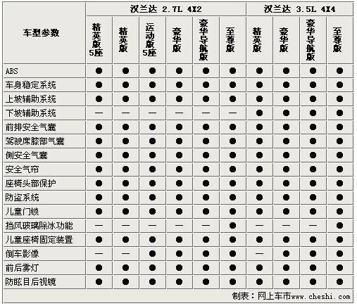 國(guó)產(chǎn)漢蘭達(dá)的安全配置還是比較齊全的,所有車(chē)型都配備的ABS、EBD、車(chē)身穩(wěn)定系統(tǒng)、7安全氣囊等裝備,尤其是車(chē)身穩(wěn)定系統(tǒng)已經(jīng)成為了漢蘭達(dá)的標(biāo)準(zhǔn)配置,該項(xiàng)配置可以大大提高車(chē)輛行駛中的安全性能。漢蘭達(dá)3.5排量的車(chē)型在配備了上坡輔助系統(tǒng)的同時(shí),還配備了下坡輔助系統(tǒng),大大提高了該車(chē)的越野性能。頂配車(chē)型上還配備了擋風(fēng)玻璃除冰功能,這是該級(jí)別車(chē)型中很少見(jiàn)到的。