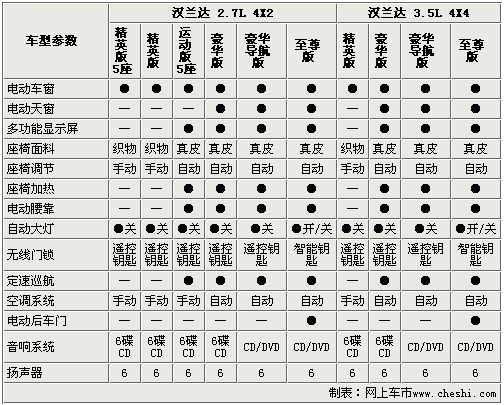 漢蘭達(dá)身為一款中高級(jí)SUV車(chē)型,所以在豪華配置上還是比較全面的,除了精英型車(chē)型外,其它車(chē)型的座椅都是真皮材質(zhì)的,而且還配備了座椅電動(dòng)調(diào)節(jié)、加熱和電動(dòng)腰靠,大大提升的漢蘭達(dá)的品質(zhì)。國(guó)產(chǎn)漢蘭達(dá)的全系車(chē)型都配備了6喇叭的音響系統(tǒng),高配車(chē)型配有DVD影音系統(tǒng)。頂配車(chē)型的尾門(mén)為電動(dòng)開(kāi)啟和關(guān)閉,大大的方便乘客使用。