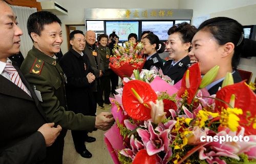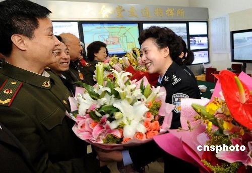 3月8日,國(guó)際婦女節(jié),出席十一屆全國(guó)政協(xié)會(huì)議的部分文藝界政協(xié)委員來(lái)到北京人民大會(huì)堂交通指揮所,向?yàn)閮蓵?huì)服務(wù)的女交警們獻(xiàn)上鮮花,表達(dá)節(jié)日的祝賀。中新社發(fā) 劉英毅 攝