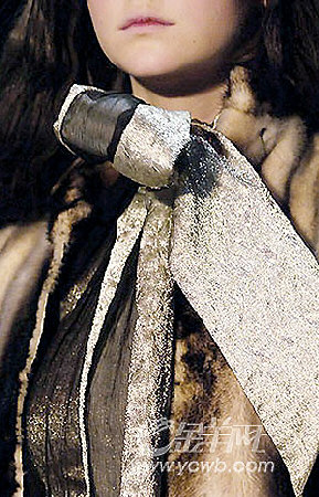 沙礫般的金屬色領(lǐng)巾系成夸耀的大蝴蝶結(jié),正好配襯皮草大衣的華麗,而拼接在金色領(lǐng)巾上的黑色薄紗則增加了幾分收斂的柔軟感覺。