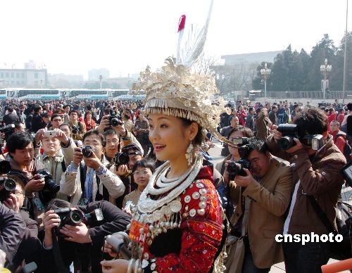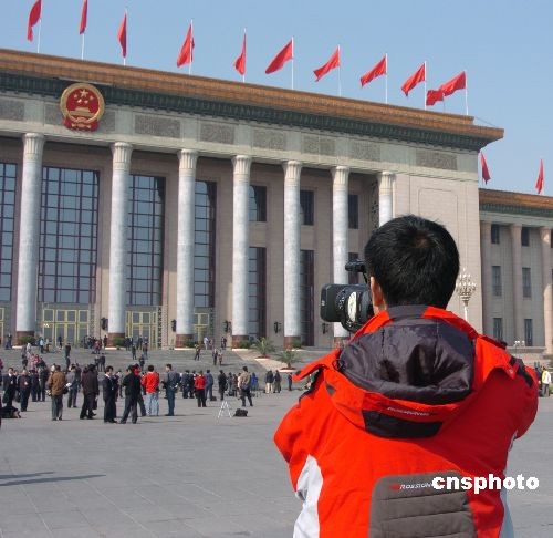 2008兩會召開期間,中外記者們奔波于人民大會堂、委員和代表們的住處,收集新聞線索,及時發(fā)回最新的會議動態(tài)和熱點、焦點話題。中新社發(fā) 毛昭勝 攝
