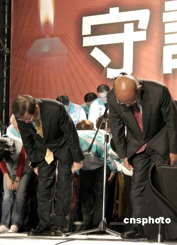 臺灣地區(qū)領導人選舉二十二日晚揭曉,謝長廷、蘇貞昌等民進黨競選團隊承認敗選,并在競選總部前廣場向支持者表達謝意。中新社發(fā) 曾嘉 攝