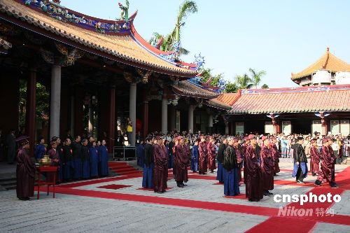 十月五日,臺北祭孔大典依舊制開始。著褐色古袍的引領人員引領“主獻官”臺北市長郝龍斌及“分獻官”、“陪祭官”等入場,郝龍斌及作為“分獻官”、“陪祭官”的十幾位臺北優(yōu)秀教師和各界代表,著藍色長袍,黑色馬褂,依次走向固定位置佇立。中新社發(fā) 楊旭 攝