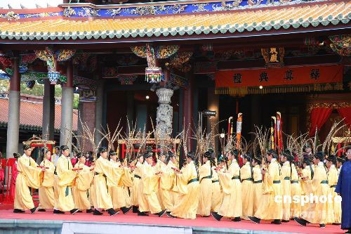十月五日舉行的臺(tái)北祭孔大典與往年不同,佾舞及雅樂(lè)演出由六佾變?yōu)榘速,即由六行六列三十六名佾生,增加到八行八列六十四名佾生。中新社發(fā) 楊旭 攝