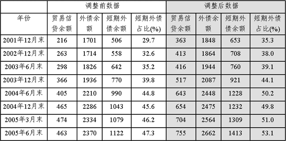 2001-2005年6月末貿(mào)易信貸統(tǒng)計(jì)方法調(diào)整前后外債有關(guān)指標(biāo)對比
