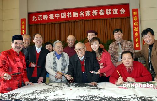 2006年2月2日,在大年初五這個(gè)迎賓納喜的好日子里,書畫家婁師白、阿老、袁熙坤、金鴻鈞、白伯驊、白啟哲、姚少華、雷公、婁述德、劉學(xué)思、姚坤、孫陽、郭玫宗等在北京晚報(bào)社會(huì)議室歡聚一堂,參加北京晚報(bào)中國書畫名家新春聯(lián)誼會(huì)。作者:廖攀