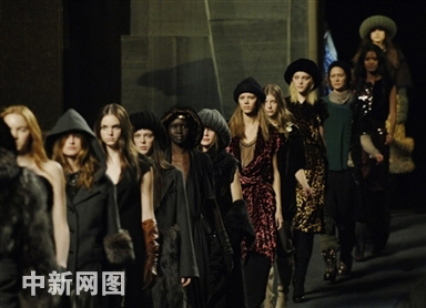 2006年2月6日,紐約時裝周,模特在展示Marc Jacobs設(shè)計的新款秋裝。華麗的細節(jié)使Marc Jacobs的作品總能奪目而不夸張。時尚的風向已經(jīng)從對奢華永無止境的追求變成了現(xiàn)在的簡單低調(diào)。設(shè)計師不再大面積使用皮草,而是將其作為點綴,使時裝展現(xiàn)出低調(diào)的奢華。