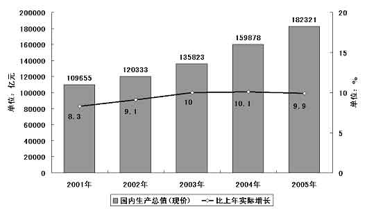圖表一 “十五”期間國內(nèi)生產(chǎn)總值及其增長率
