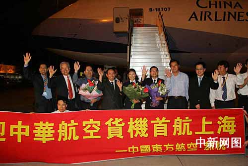 據(jù)香港中通社報(bào)道,兩岸項(xiàng)目貨運(yùn)包機(jī)的第一個(gè)航班由華航派出一架波音747-400全貨機(jī)執(zhí)行,20日零時(shí)33分飛抵上海浦東國際機(jī)場,3時(shí)20分從浦東機(jī)場起飛,返回臺(tái)北桃園國際機(jī)場。