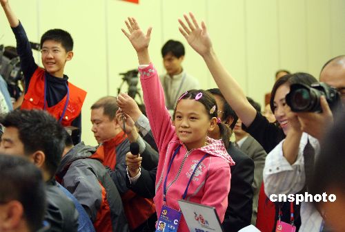 十月二十日晚,出席中共十七大的國(guó)家文化部副部長(zhǎng)于幼軍、教育部副部長(zhǎng)袁貴仁、全國(guó)婦聯(lián)副主席黃晴宜、共青團(tuán)中央書記處第一書記胡春華、國(guó)家廣播電影電視總局副局長(zhǎng)趙實(shí)等代表就未成年人教育問題,在北京梅地亞中心接受中外媒體采訪。中新社發(fā) 毛建軍 攝