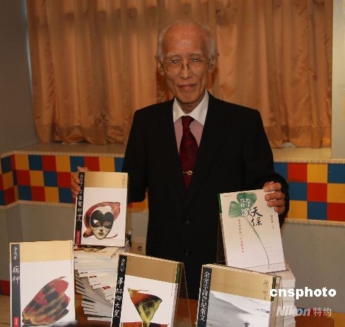 為祝賀詩人余光中八十大壽,臺灣九歌出版社特意出版余光中最新詩集《藕神》、近十年的文學評論精選《舉杯向天笑》、翻譯英國名作家王爾德的劇本《不要緊的女人》等五本書,展現(xiàn)他在文學路上的成就。十月二日,臺灣藝文界提前為他祝壽,余先生在五本新書前留影。中新社發(fā) 耿軍 攝