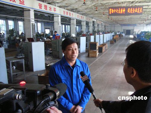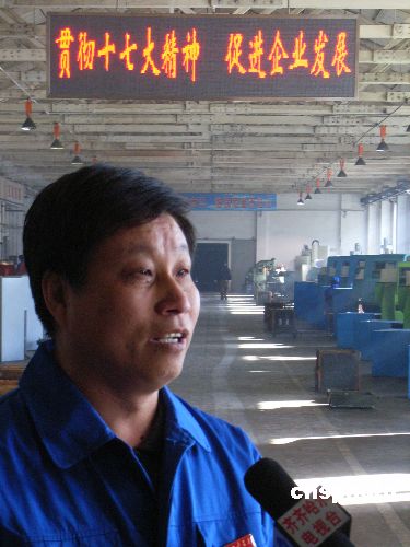 10月22日,齊齊哈爾建華公司黨委書(shū)記在接受采訪。當(dāng)日,中國(guó)共產(chǎn)黨第十七屆中央委員會(huì)第一次全體會(huì)議勝利閉幕。國(guó)家老工業(yè)基地齊齊哈爾市的產(chǎn)業(yè)工人非常高興,中國(guó)兵器工業(yè)集團(tuán)公司齊齊哈爾建華公司黨委書(shū)記谷云龍代表全體員工表示:堅(jiān)決擁護(hù)十七大的各項(xiàng)決議,擁護(hù)新一屆中央領(lǐng)導(dǎo)集體,緊密地團(tuán)結(jié)在黨中央周圍,不斷增強(qiáng)自主創(chuàng)新能力,為國(guó)家發(fā)展,社會(huì)和諧人民進(jìn)步多做貢獻(xiàn)。中新社發(fā) 王云龍 攝