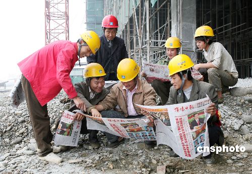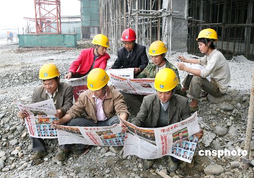 10月23日上午,綿陽長虹工業(yè)園虹歐PDP項目建筑工地,中建公司的農(nóng)民工在閱看《綿陽日報》有關(guān)十七大的報道。他們看到十七大報告中關(guān)于完善和落實國家對農(nóng)民工的政策,依法維護勞動者權(quán)益等內(nèi)容后喜笑顏開,表示將安全生產(chǎn),把工程項目盡快完成,為祖國建設(shè)貢獻自己的力量。中新社發(fā) 蒲滔 攝