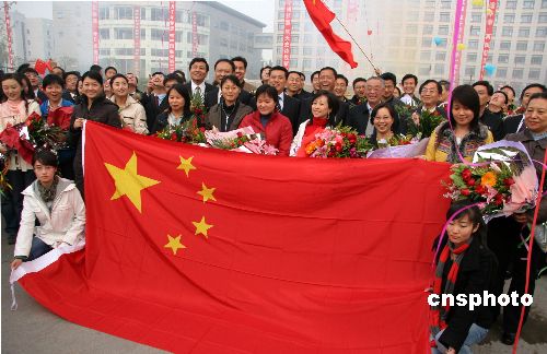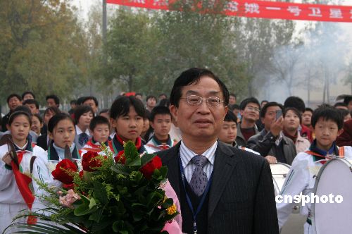 十一月七日下午,中國首顆月球探測衛(wèi)星“嫦娥一號”研制單位——中國空間技術(shù)研究院舉行盛大歡慶活動,慶!版隙鹨惶枴毙l(wèi)星成功進(jìn)入工作軌道,歡迎該院“嫦娥一號”衛(wèi)星試驗(yàn)隊(duì)凱旋。中新社發(fā) 孫自法 攝