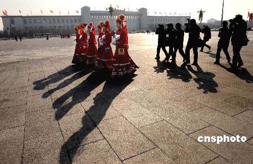 三月五日上午九時(shí),十一屆全國人大一次會(huì)議在北京人民大會(huì)堂隆重開幕。攝影記者在天安門廣場窮追不舍拍攝穿著少數(shù)民族服飾的亮麗女服務(wù)員。中新社發(fā) 廖攀 攝
