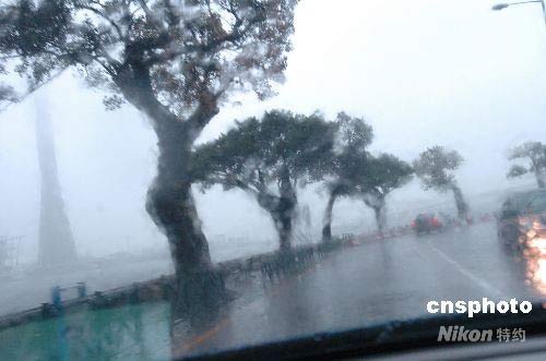 四月十九日,“浣熊”臺(tái)風(fēng)登陸澳門,當(dāng)?shù)貟炱鸢颂?hào)風(fēng)球 ,街面狂風(fēng)大作,暴雨傾盆,造成碼頭停航,橋梁封路。中新社發(fā) 史利 攝