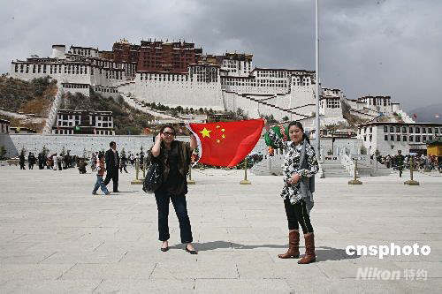 圖:游客布達(dá)拉宮前展國旗支持奧運