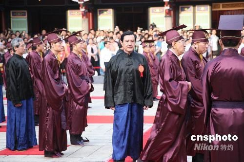 晨六時,天放亮,“鼓三嚴(yán)”,祭典依舊制開始。著褐色古袍的引領(lǐng)人員引領(lǐng)“主獻官”臺北市長郝龍斌及“分獻官”、“陪祭官”等入場,郝龍斌及作為“分獻官”、“陪祭官”的十幾位臺北優(yōu)秀教師和各界代表,著藍色長袍,黑色馬褂,依次走向固定位置佇立。