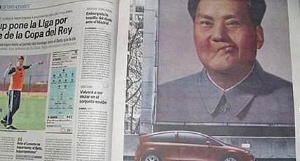 1月8日,西班牙大報之一《國家報》在第15版上刊登一個整版的法國雪鐵龍汽車廣告。廣告畫面是中國已故領(lǐng)袖毛澤東的照片,而且毛澤東的形象被廣告設(shè)計者進行了肆意篡改,被電腦技術(shù)改得神態(tài)奇怪。