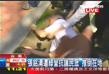 2008年10月21日,大陸海協(xié)副會(huì)長(zhǎng)張銘清在臺(tái)進(jìn)行學(xué)術(shù)交流到臺(tái)南市參觀時(shí),被極端分子推倒在地;當(dāng)張銘清準(zhǔn)備乘車離開(kāi)時(shí),有人甚至跳上張銘清座車車頂狂踩,試圖阻止張銘清離開(kāi)。