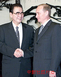 中國(guó)全國(guó)人大常委會(huì)委員長(zhǎng)李鵬,7月18日在北京會(huì)見(jiàn)俄羅斯總統(tǒng)普京。中新社記者 滿會(huì)喬 攝