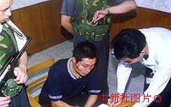 重慶警方9月19日晚21時(shí)50分在重慶渝中區(qū)觀音巖捕獲渝、湘、鄂系列槍支搶劫案首犯張君。圖為張君被捕獲后接受警方審問。作者:石智勇