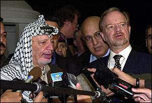 圖文:巴以美三方將舉行最高級(jí)會(huì)議 2000年10月12日 15:20 ![]() 歐盟外交事務(wù)官索拉納(左)會(huì)見約旦國(guó)王阿卜杜拉(右),討論化解以巴危機(jī)。 ![]() 英國(guó)外交大臣庫克(右)與巴勒斯坦領(lǐng)袖阿拉法特會(huì)晤,商討以巴局勢(shì)。 ![]() 以巴流血沖突今天再造成至少2人死亡。 中新網(wǎng)北京10月12日消息:經(jīng)過多日穿梭中東的“斡旋旅程”后,聯(lián)合國(guó)秘書長(zhǎng)安南宣布,以巴領(lǐng)袖已經(jīng)同意參加由美國(guó)主持的三方高層安全會(huì)議,以停止以巴暴力沖突。而隨行的聯(lián)合國(guó)發(fā)言人埃克哈德表示,安南認(rèn)為,這是終止以巴沖突,及重開以巴和平進(jìn)程會(huì)談的重要一步。 估計(jì)峰會(huì)最早會(huì)在周四舉行。 以巴沖突今天進(jìn)入第14天,多國(guó)高層官員及聯(lián)合國(guó)秘書長(zhǎng)安南不停穿梭中東地區(qū),斡旋以巴;稹 聯(lián)合國(guó)發(fā)言人表示,這項(xiàng)于1998手成立的三方安全委員會(huì)大會(huì),將首度由三方最高階層與會(huì),以解決暴力沖突問題。而會(huì)議將由以巴雙方的高級(jí)軍官及安全官員出席,由美國(guó)中情局局長(zhǎng)特內(nèi)擔(dān)任主席。預(yù)計(jì)會(huì)議將在周四展開。 安南將會(huì)前往黎巴嫩,協(xié)助救出3名被黎巴嫩真主黨擄走的以軍。另一方面,以巴雙方并未證實(shí)會(huì)出席會(huì)議。因?yàn)橐陨蓄I(lǐng)袖巴拉克與巴勒斯坦領(lǐng)袖阿拉法特均要咨詢雙方的軍官。 埃及總統(tǒng)穆巴拉克則繼續(xù)拒絕在開羅召開四方峰會(huì),認(rèn)為峰會(huì)必須在以軍愿意撤離巴勒斯坦部地區(qū),及接受成立國(guó)際調(diào)查委員會(huì),以了解事發(fā)原因。同時(shí),希望在10月21日舉行阿拉伯峰會(huì)后,以巴雙方才展開會(huì)談。而意大利則提出愿作為峰會(huì)的會(huì)談場(chǎng)地。 以巴雙方領(lǐng)袖則繼續(xù)指責(zé)對(duì)方在成立國(guó)際調(diào)查委員會(huì)的細(xì)節(jié)上不肯讓步以及以軍在沖突中濫用暴力等。巴拉克發(fā)出警告說,巴國(guó)官方近日釋放了數(shù)名伊斯蘭激進(jìn)分子,并讓他們發(fā)動(dòng)恐怖襲擊,并呼吁以色列人要小心防衛(wèi)。 盡管以巴暴力沖突規(guī)模已縮少,但今日至少又有2名巴勒斯坦人在沖突中喪生。沖突已造成100多人死亡,數(shù)以千計(jì)的人受傷。(圖文據(jù)外電) |