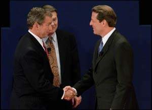 圖文:美國總統(tǒng)候選人展開第二場辯論 2000年10月12日 16:16 ![]() 距離11月7號的大選不足4周,戈爾(右)與小布什(左)再度在電視辯論上交鋒。兩人在開始交戰(zhàn)時,先握手示好。 中新網(wǎng)北京10月12日消息:美國民主黨總統(tǒng)候選人、現(xiàn)任副總統(tǒng)戈爾,與共和黨總統(tǒng)候選人、得州州長布什,已經(jīng)在美東時間周三晚9時展開他們的第二場辯論。 這次辯論在北卡羅萊納州的WakeForest大學舉行,并仍然由公共電視臺(PBS)的萊勒主持。 這次辯論的方式將不同于第一次。兩位總統(tǒng)候選人采取隨意的談話方式,坐下來回答主持人的提問。這正是布什所擅長的方式。每人有2分鐘的時間回答提問,在辯論結(jié)束時,有2分鐘的時間作結(jié)束演講。 估計兩人會繼續(xù)就政府角色和架構(gòu)針鋒相對,但中東和平和南斯拉夫局勢等外交問題也會是辯論的議題之一。 戈爾布什的第一場辯論已于本月3日晚進行,原來預期多達7,500萬民眾收看首場辯論。但實際上只有4,600萬人收看了第一場辯論。 首場辯論會結(jié)束后,美國各大媒體做的民調(diào)顯示,民眾認為戈爾的表現(xiàn)略勝布什一籌,但戈爾未能擴大領(lǐng)先布什的優(yōu)勢。首場辯論對選民并未產(chǎn)生預期的影響,民調(diào)表明,在首場辯論后,仍然有超過22%的選民心意未決。(圖文據(jù)外電) |