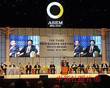 第三屆亞歐首腦會議開幕式大屏幕上顯示朱镕基總理的形象。中新社記者:王曉暉 攝