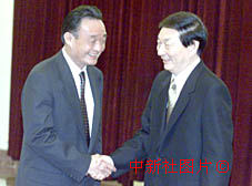 中國(guó)國(guó)務(wù)院總理朱镕基訪問(wèn)日本、韓國(guó)后,22日乘專機(jī)回到北京,國(guó)務(wù)院副總理吳邦國(guó)等在北京人民大會(huì)堂迎接。中新社記者 毛建軍 攝