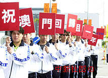 圖片:澳門(mén)電信局職工參加慶祝回歸一周年活動(dòng) 2000年12月18日 15:44 ![]() 澳門(mén)電信局職工十六日手舉標(biāo)語(yǔ)牌,參加慶祝回歸一周年的系列活動(dòng)。中新社傳真 宗金柱攝