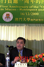 圖文:“根在澳門”馬若龍?jiān)跁?huì)上發(fā)言 2000年12月18日 16:30 ![]() 慶;貧w一周年,澳門大學(xué)十六日舉行“一國(guó)兩制在澳門實(shí)踐一周年的回顧與前瞻”研討會(huì),圖為土生葡人社團(tuán)“根在澳門”主席馬若龍?jiān)跁?huì)上發(fā)言。中新社傳真 宗金柱攝