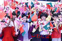 。國家主席江澤民和夫人王冶坪19日下午乘專機(jī)抵達(dá)澳門機(jī)場。150名小朋友手舉國旗、區(qū)旗和鮮花在機(jī)場歡迎江澤民主席和夫人抵達(dá)澳門。中新社傳真 滿會喬攝