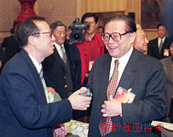 江澤民主席十四日到九屆全國人大三次會議北京代表團(tuán)參加討論,與科技界著名人士王選交談。中新社記者 李剛 攝