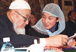 來自甘肅的保安族少女馬香梅(右)是出席九屆全國人大三次會議的代表中年齡最小的一位。圖為她與人大代表、甘肅省伊斯蘭教協(xié)會會長楊森十四日在小組會上討論。作者:王麗南